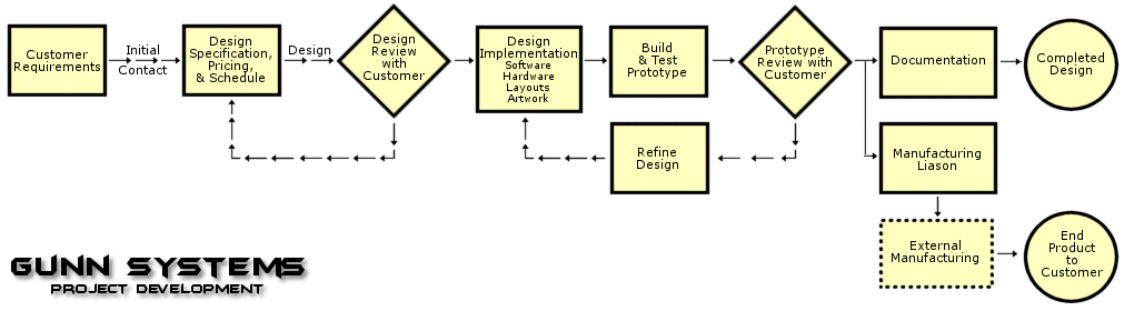 With a physical proof-of-concept in your hands, you'll get more mileage from meetings with customers, partners, and management. You'll go into the process with a clear idea of what is truly feasible and realistic data on how much production quantities will cost. We have a successful track record of developing products from concept to production. It's easy to get started. Unlike consultants, who actually profit from delays, we lose money on the prototype, and only make it back if your product is a success. We have a vested interest in getting your prototype done quickly and getting it done right. We let you focus on what you know best--selling your product--and we'll focus on what we know best--building the electronics for it. It's in Gunn Systems' best interest help you get to market with a good, cost-effective product quickly. You benefit, we benefit, and your customer benefits. Here's how it works: